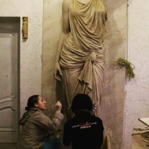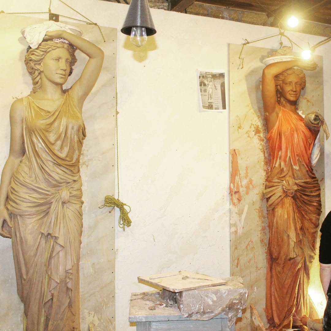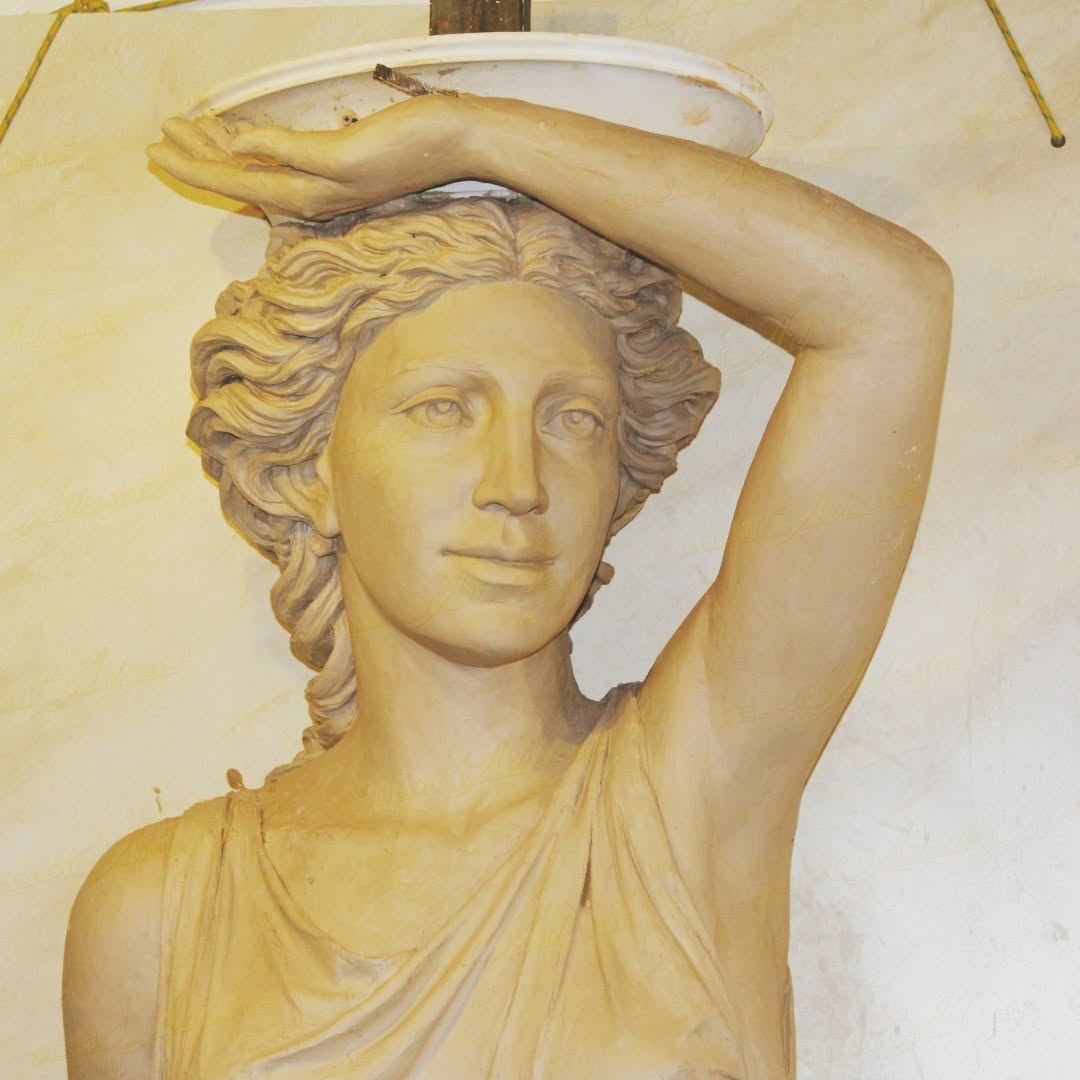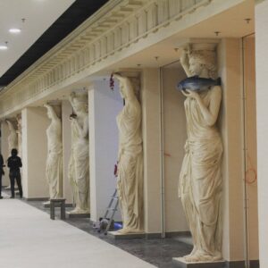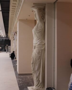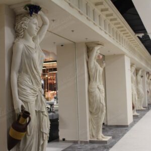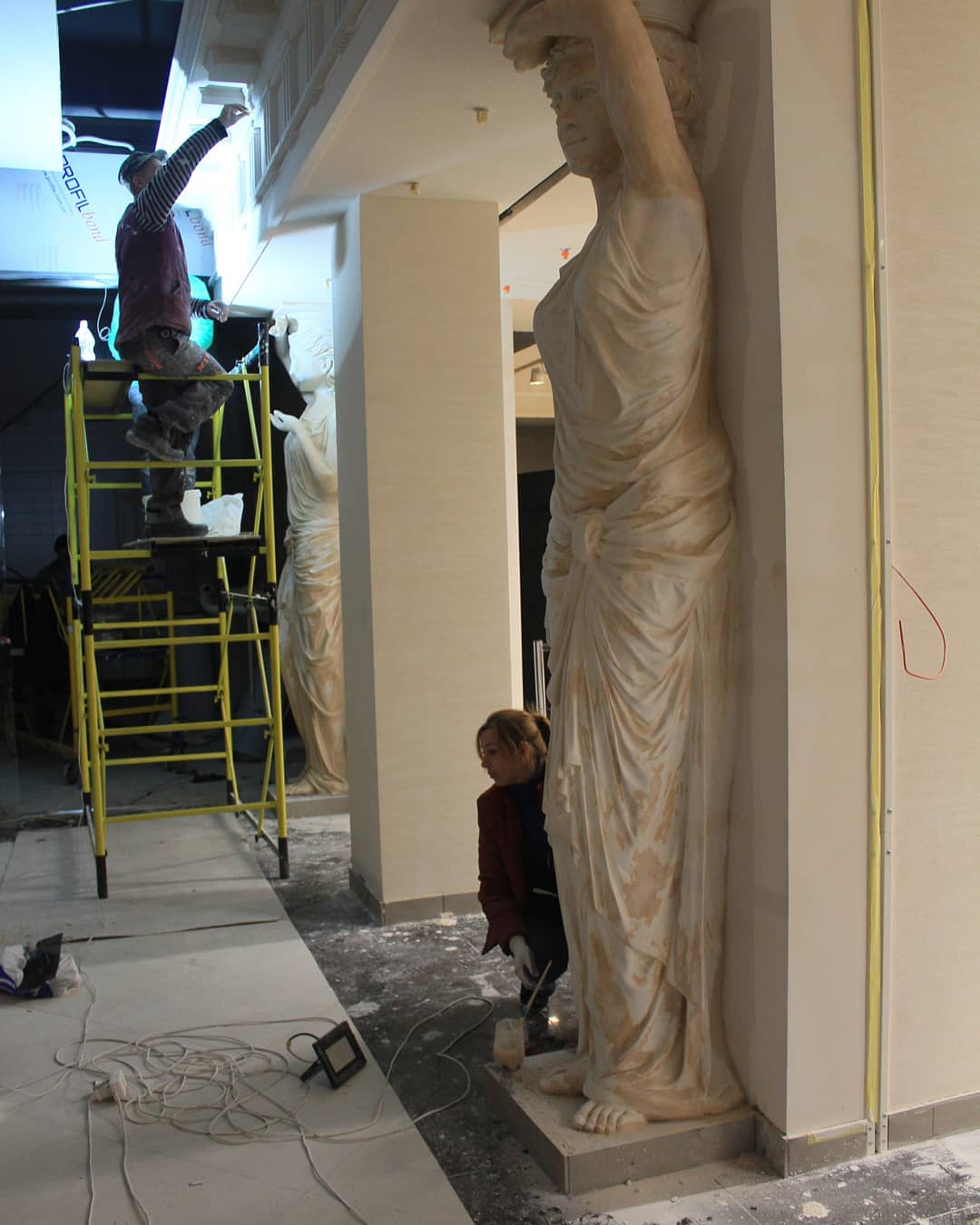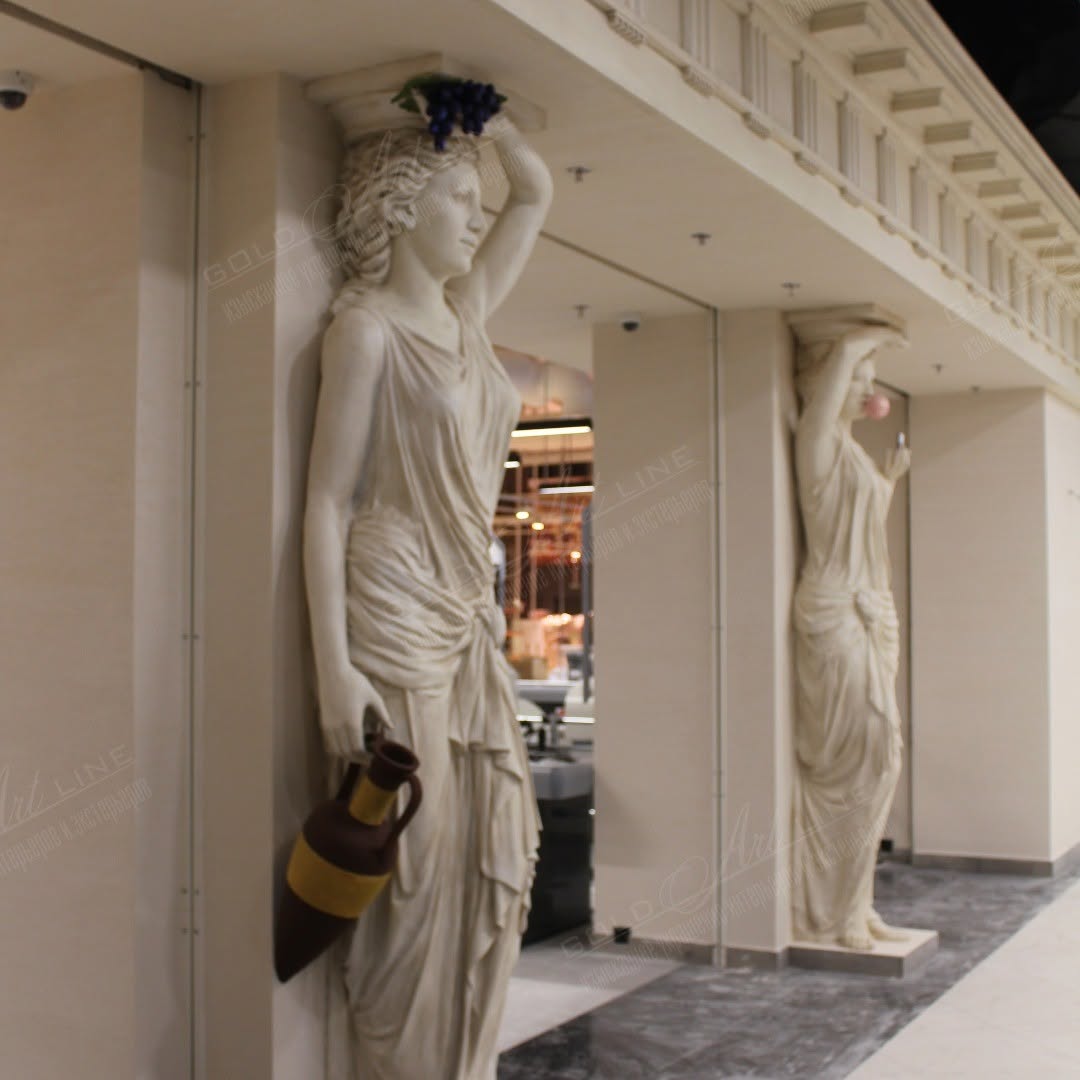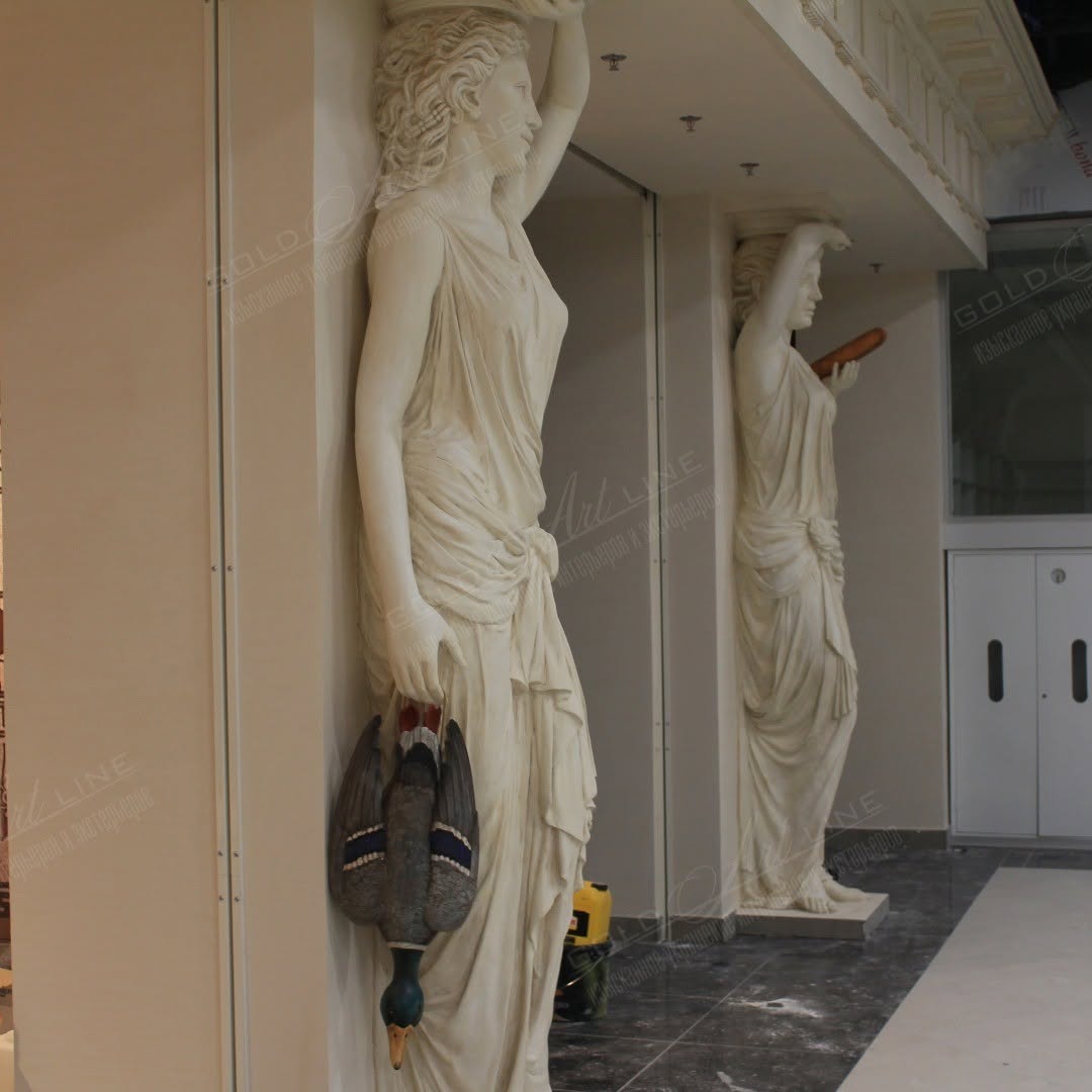 Виконані з текстурованого матеріалу гіпсу та патинуванням, ці фігури гармонійно поєднують в собі античну естетику й сучасний підхід до декору. Каріатиди немов тримають на собі простір — це не лише елемент оформлення, а й візуальна опора, що наповнює приміщення змістом, формою та присутністю.