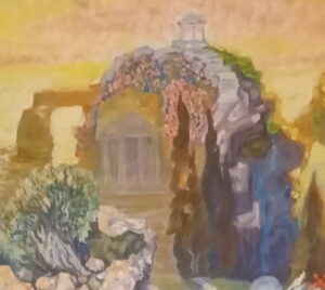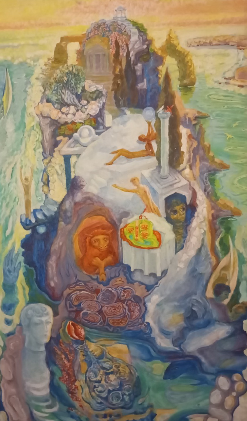 Центральна композиція — вузький білий півострів, який веде до храму серед скель, укритих квітами. Уздовж цього шляху розміщені фігури: оголені людські тіла в неквапливих позах, ніби застиглі в мить безтурботності. Це образи спогадів про безтурботне літо, тілесність, молодість.