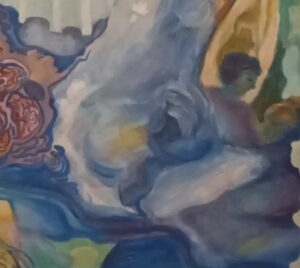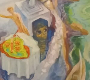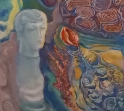На першому плані бачимо мармурову голову античного бюста, що занурена у хвилі — символ втраченої культури або забутої епохи. Поряд із нею — морські форми, що нагадують як корали, так і внутрішні органи, натякаючи на глибини підсвідомості.