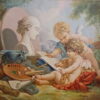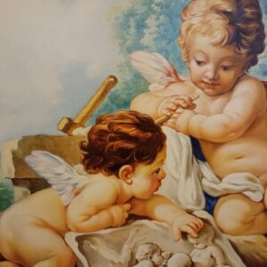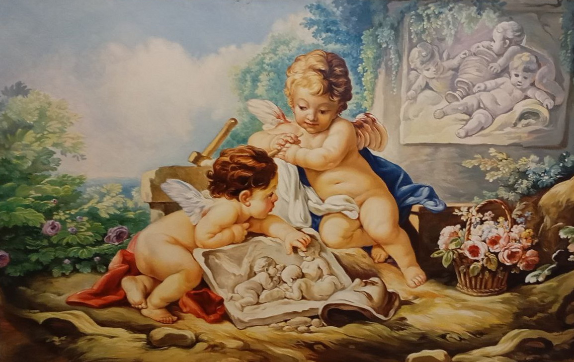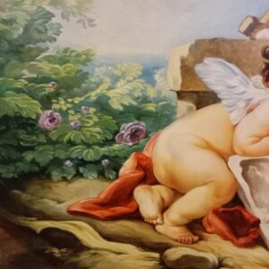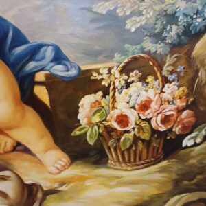 Картина зображує маленького ангела з крилами, що спочиває на кам’яній поверхні серед природи. Ангел одягнений у легкий червоний плащ, а навколо нього розкидано буйну зелень із ніжно-рожевими квітами. Поруч стоїть кошик, наповнений яскравими квітами, що додає сцені теплоти та гармонії. Фон із м’якими пастельними тонами та легким туманом створює атмосферу спокою й умиротворення, типову для стилю рококо.
