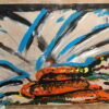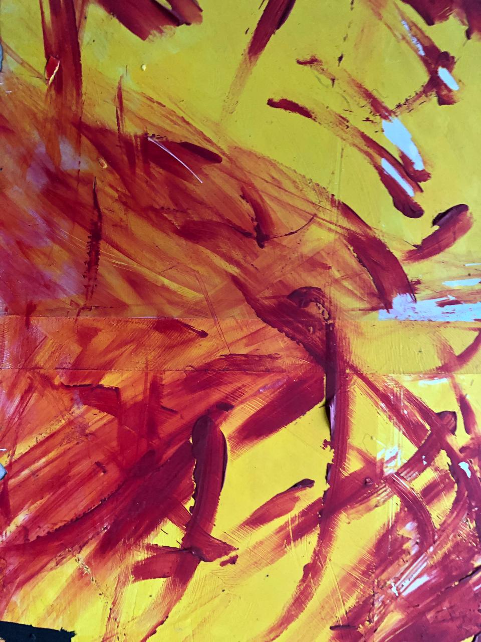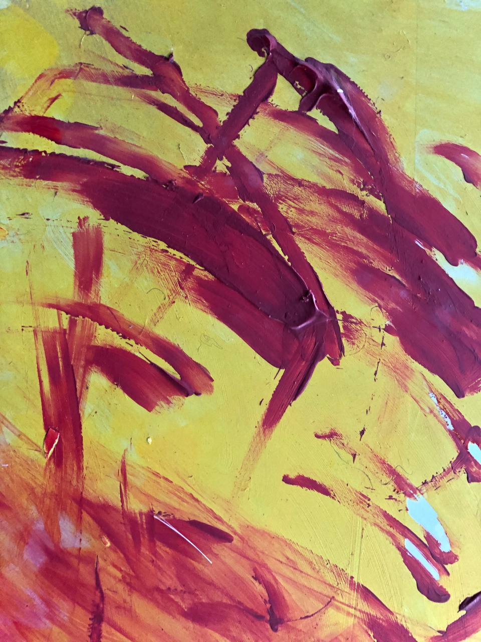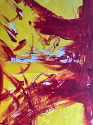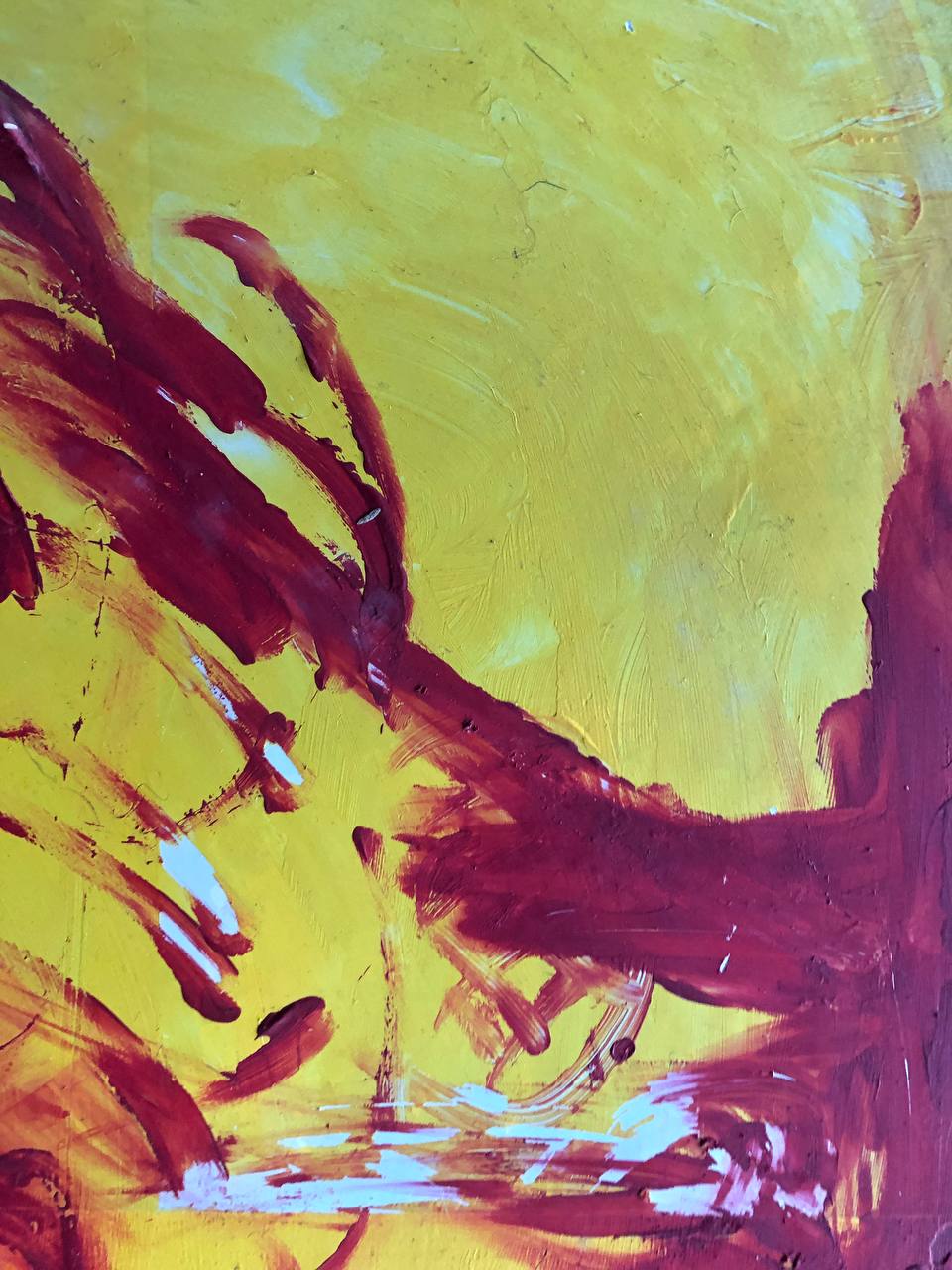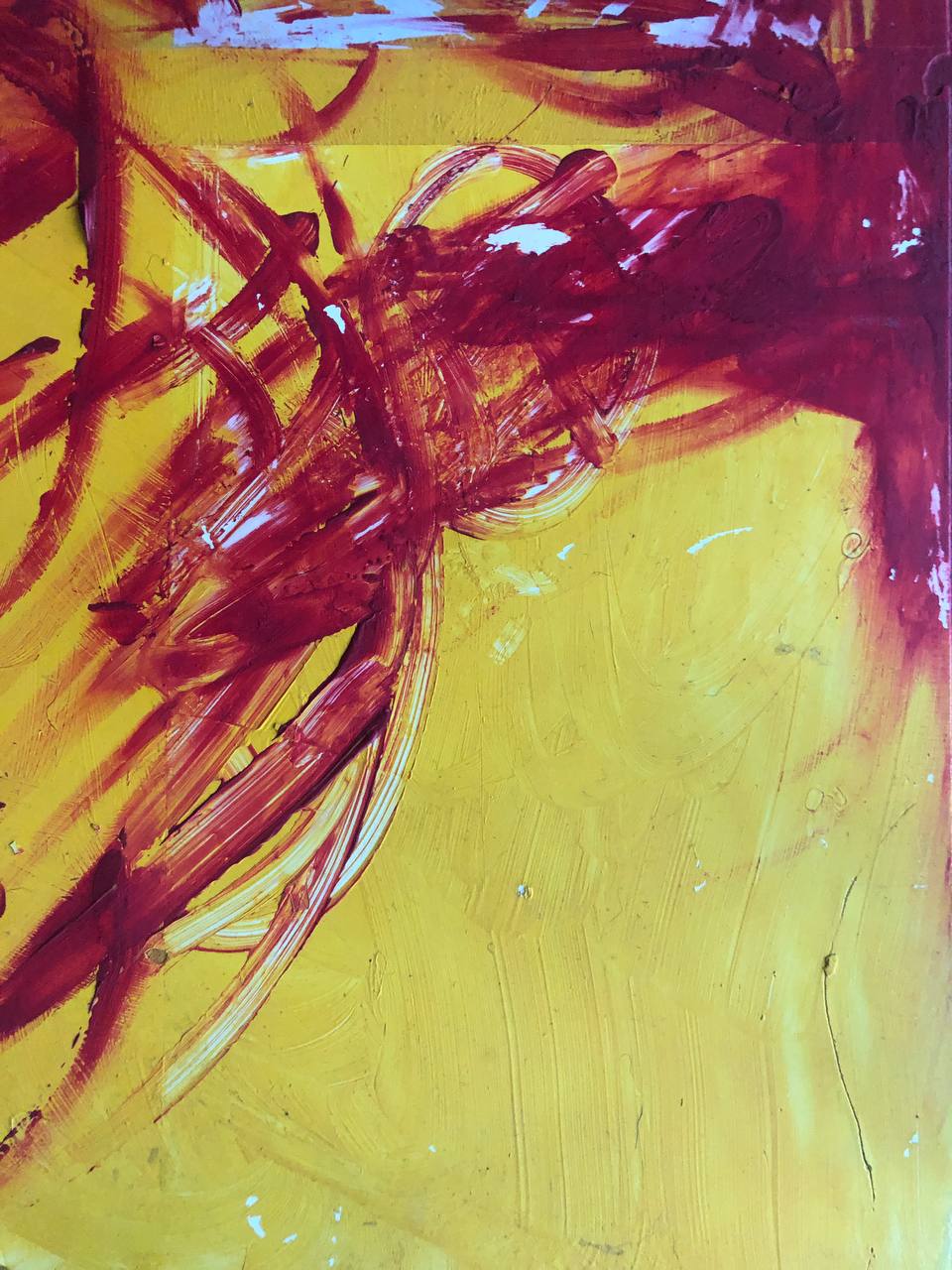 Полотно побудоване на потужному контрасті яскраво-жовтого фону та динамічних червоно-помаранчевих мазків, які розлітаються від центру догори і в боки.