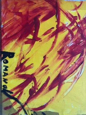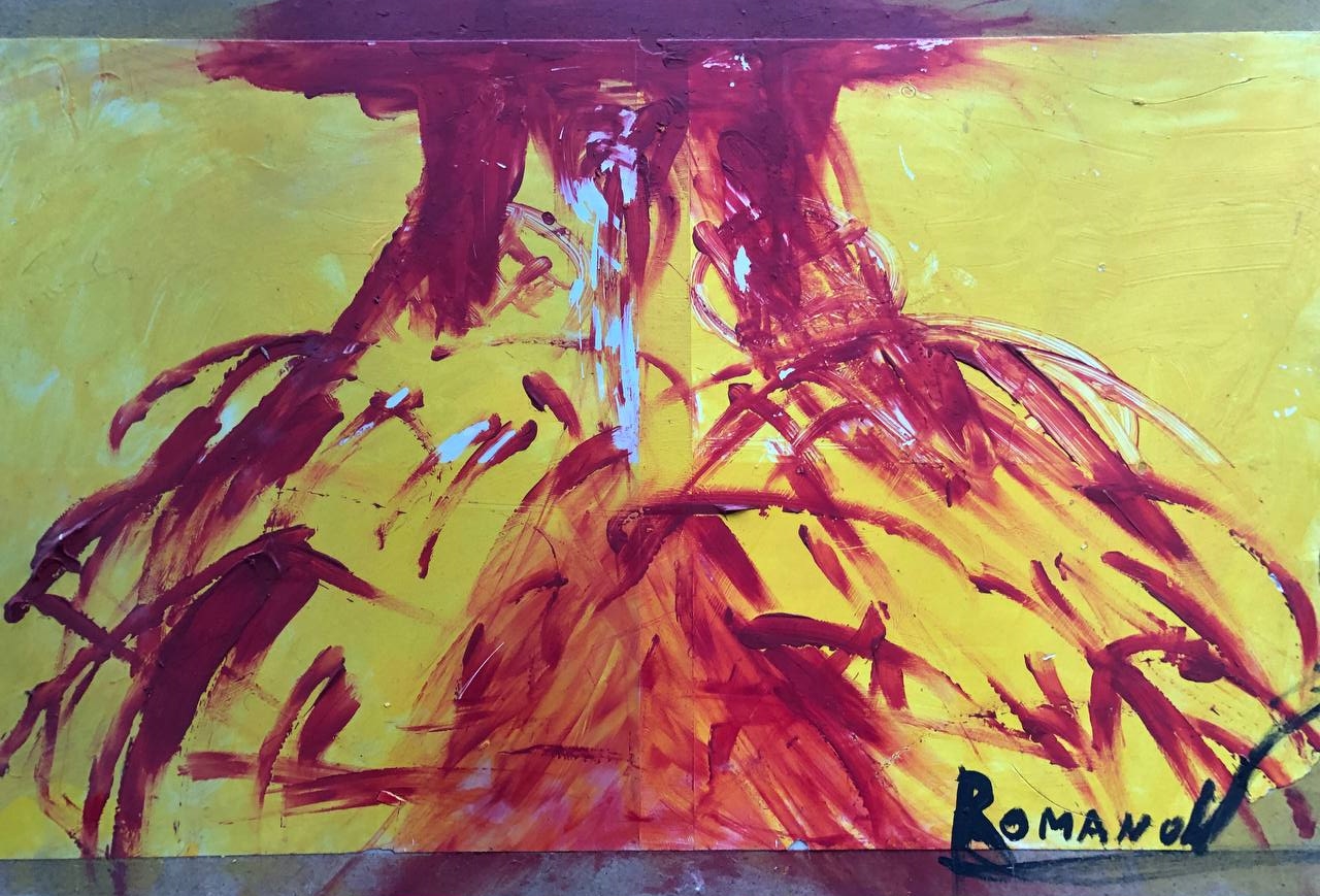 Внизу праворуч чітко виділяється підпис: ROMANOV, який підкреслює особисту емоційну залученість митця у цей образ вибухової трансформації.